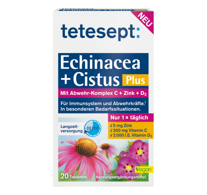 قرص‌های اکیناسه + سیستوس تتسپت، به واسطه ویتامین‌های C و D3 و همچنین روی، از دفاع بدن پشتیبانی می‌کنند. آن‌ها همچنین حاوی عصاره‌های گیاهی اکیناسه و سیستوس هستند. به لطف فناوری رهش پایدار تتسپت، بدن به طور پیوسته مواد مغذی و عصاره‌های گیاهی طبیعی اکیناسه و سیستوس را در طی چند ساعت دریافت می‌کند. برای حمایت از سیستم ایمنی و سلامت کلی بدن – فقط با یک قرص.